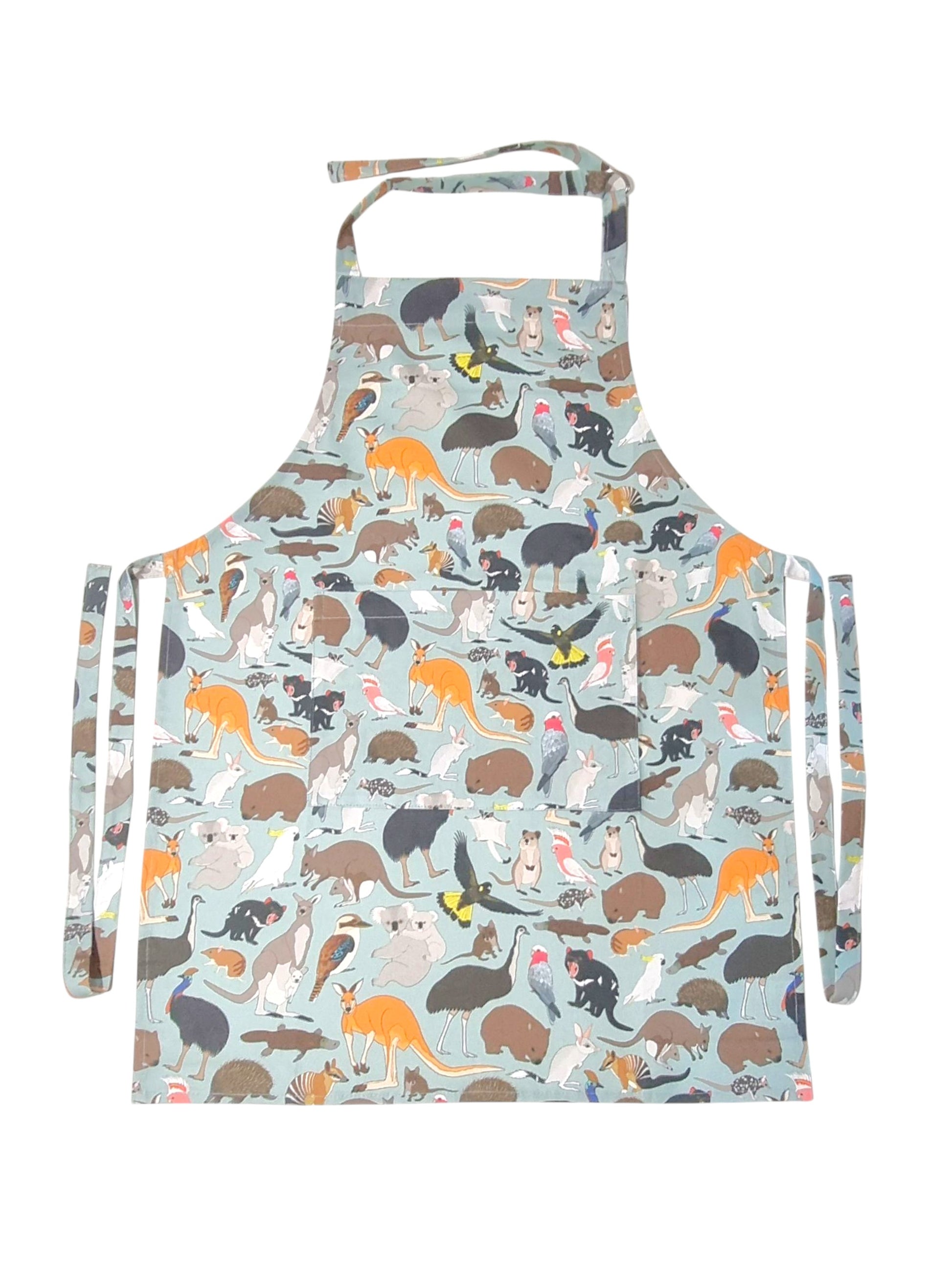 This apron is made from 100% recycled cotton and features a bright, fun design of lots of different Australian animals drawn by Jen. Good for the environment while making cooking and creating fun!