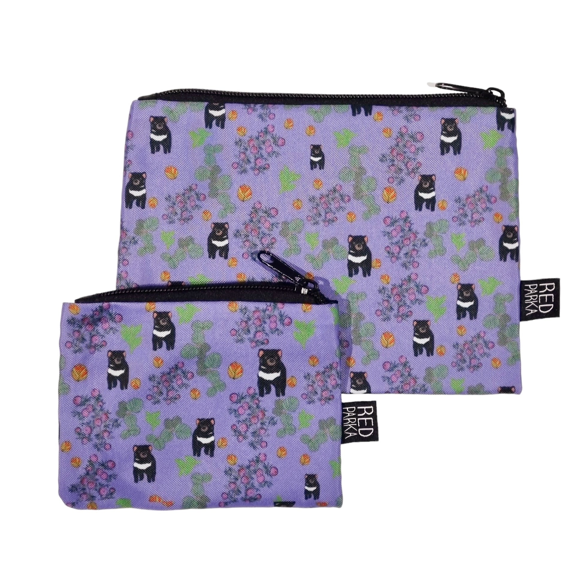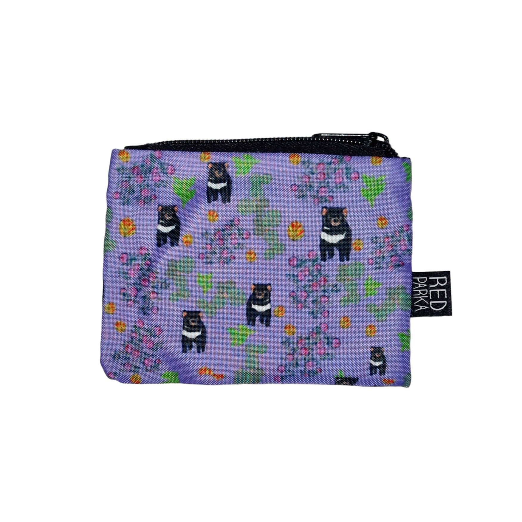 Tasmanian Devils play amongst the Mountain Berries and endemic Fagus on these adorable pouches, made with recycled polyester sourced from recycled bottles and post-consumer waste.