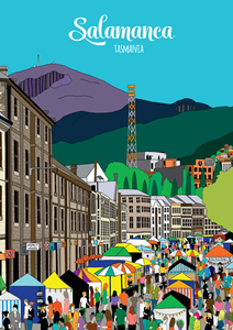 This 100% recycled postcard features an original illustration by Jennifer Cossins of Hobart's famous Salamanca.
